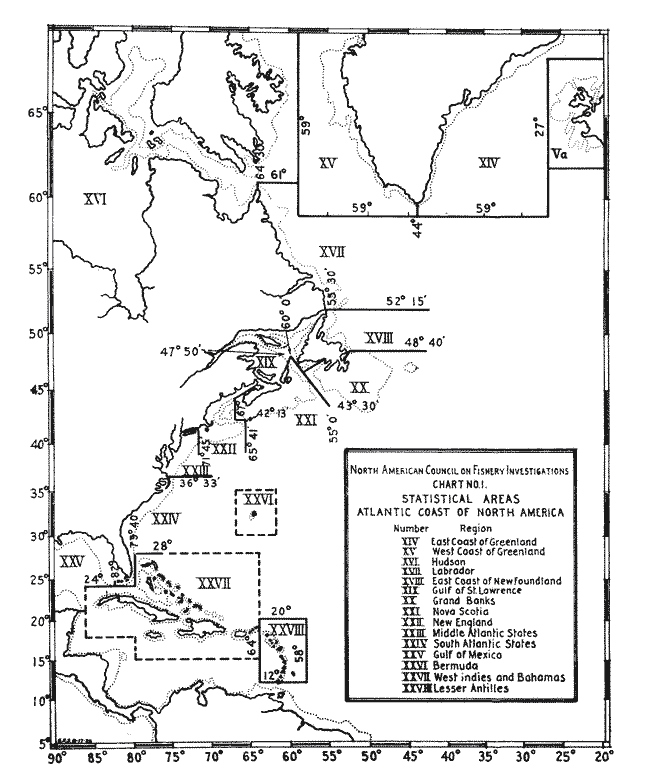 The first major fisheries of the east coast of North America predate the formation of ICNAF by 425 years. Starting in the late 1500s, France and Portugal, followed later by Spain and England developed the first long distant fleets fishing for cod on the Grand Banks off Newfoundland (Innis, 1978, Lear 1998). The early fishery based almost exclusively on cod, was recording as much as 30 000 – 40 000 tons by the end of the century. Much of that early effort was carried out by long lining; trawling came much later. To the south in USA waters, commercial long lining began primarily near shore soon after the first colonists arrived in New England in the early-1600s. Beginning in the mid-1700s, fishing expanded, reaching further offshore to the Georges Bank. Major fisheries developed to include other groundfish. The fishing areas expanded from the Newfoundland waters to the New England waters and eventually expanded to include all the fishing areas of the Northwest Atlantic. Catches during this time had increased to well over 100 000 tons annually.