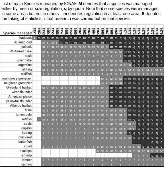 Other regulatory measures put in place by ICNAF included minimum fish size (kept), closed areas and seasons and fishing effort restrictions. However no other measures were as effective in reducing pressure on the stocks as quota regulation.
